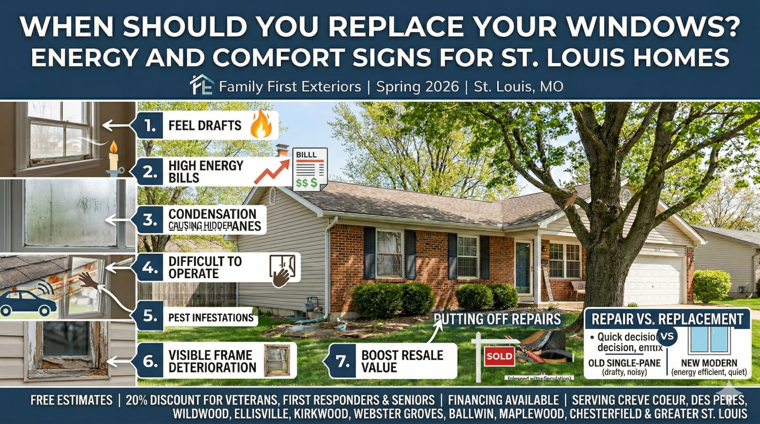 If any of the signs in this guide sound familiar, it’s worth getting a professional assessment. Family First Exteriors provides free in-home estimates for replacement window projects throughout the greater St. Louis area. We’ll evaluate your current windows, discuss your priorities, walk you through your options, and give you a straightforward quote with no hidden fees or pressure to commit on the spot.